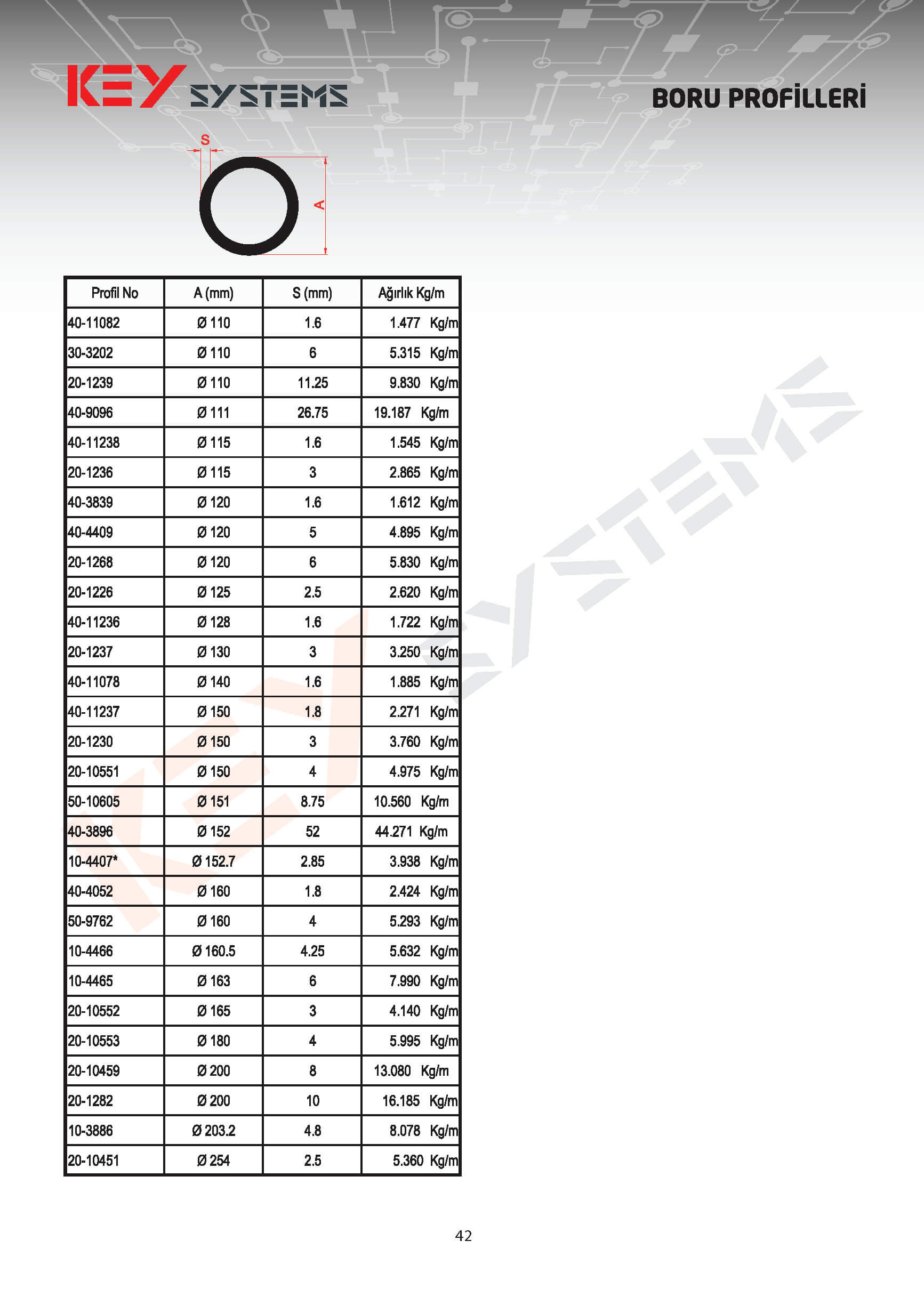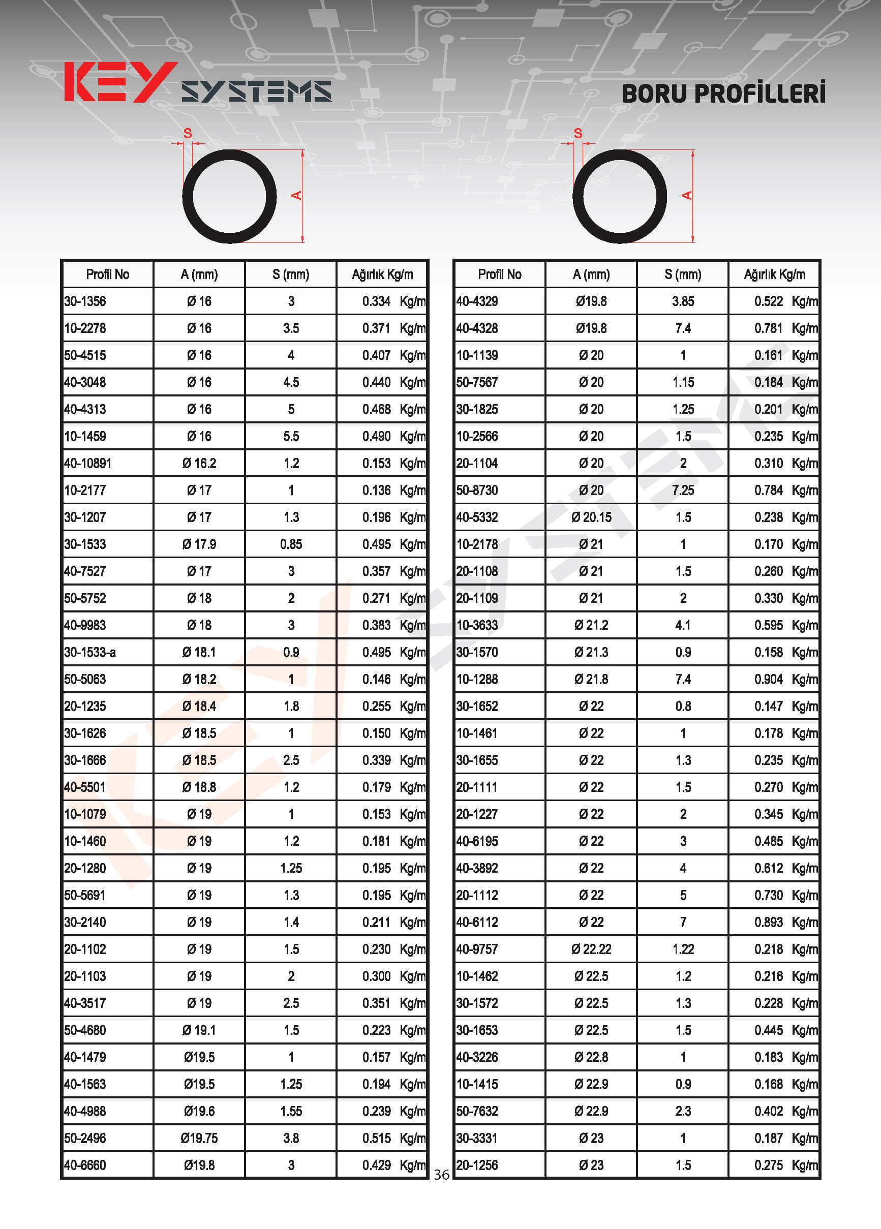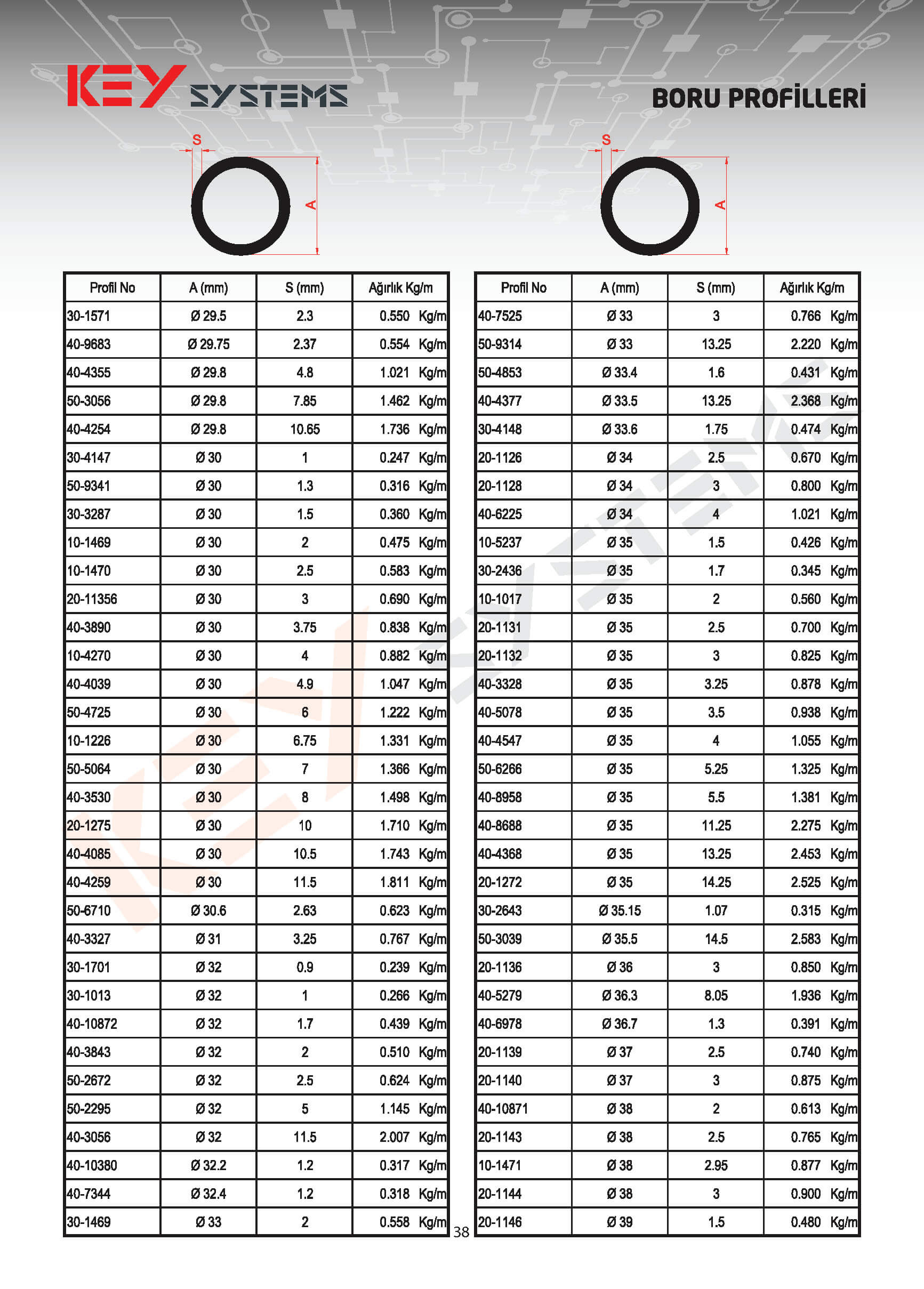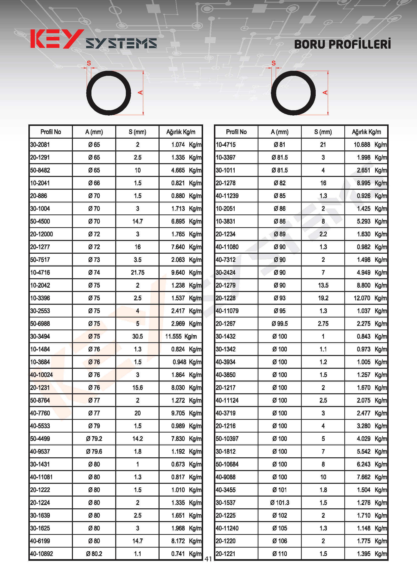 KEY YAPI SİSTEMLERİ olarak farklı boyut ve ebatlarda standart alüminyum boru profilleri ile ihtiyaçlarınıza uygun ürün çeşitliliği sayesinde sizlere en iyi hizmeti vermektedir. Eloksal ve Elektrostatik toz boya seçenekleri ile istenilen yüzey rengi uygulanabilmektedir. | ||