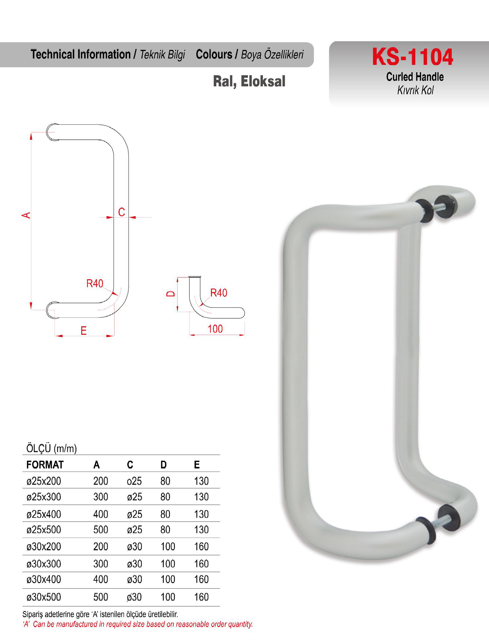 KS-1104 Alüminyum Çekme Kıvrık Kapı Kolu. Alüminyum Kapı Sistemleri için tasarlanmıştır. Farklı ebat ve ölçü seçenekleri mevcuttur. Kolay Montaj ile zaman tasarrufu sağlar. KS-1104 Kıvrık Kol, Eloksal ve Elektrostatik toz boya seçenekleri ile istenilen yüzey rengi uygulanabilmektedir. |