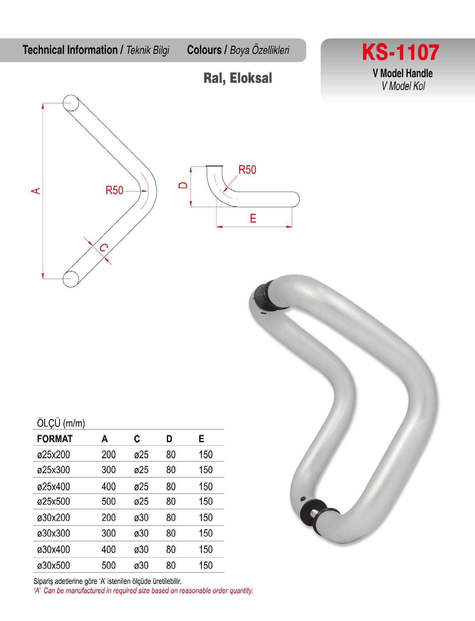 KS-1107 Alüminyum Çekme V Model Kapı Kolu. Alüminyum Kapı Sistemleri için tasarlanmıştır. Farklı ebat ve ölçü seçenekleri mevcuttur. Kolay Montaj ile zaman tasarrufu sağlar. KS-1107 V Model Kapı Kolu, Eloksal ve Elektrostatik toz boya seçenekleri ile istenilen yüzey rengi uygulanabilmektedir. |