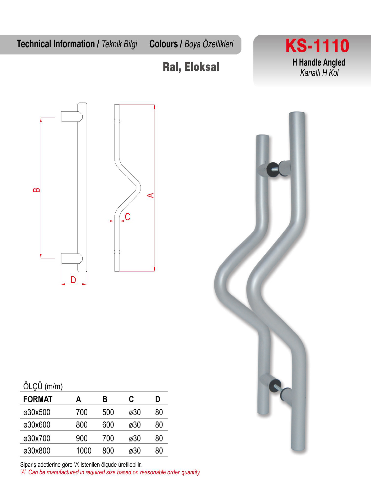 KS-1110 Alüminyum Çekme Kanallı H Kapı Kolu. Alüminyum Kapı Sistemleri için tasarlanmıştır. Farklı ebat ve ölçü seçenekleri mevcuttur. Kolay Montaj ile zaman tasarrufu sağlar. KS-1110 Kanallı H Kapı Kolu, Eloksal ve Elektrostatik toz boya seçenekleri ile istenilen yüzey rengi uygulanabilmektedir. |