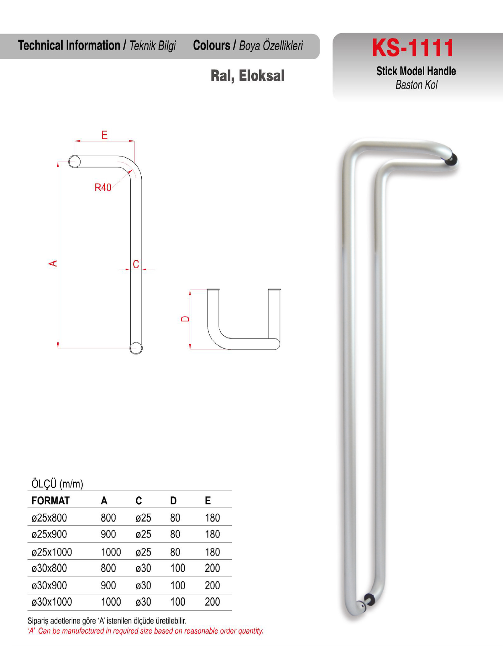 KS-1111 Alüminyum Çekme Baston Kapı Kolu. Alüminyum Kapı Sistemleri için tasarlanmıştır. Farklı ebat ve ölçü seçenekleri mevcuttur. Kolay Montaj ile zaman tasarrufu sağlar. KS-1111 Baston Kol, Eloksal ve Elektrostatik toz boya seçenekleri ile istenilen yüzey rengi uygulanabilmektedir. |