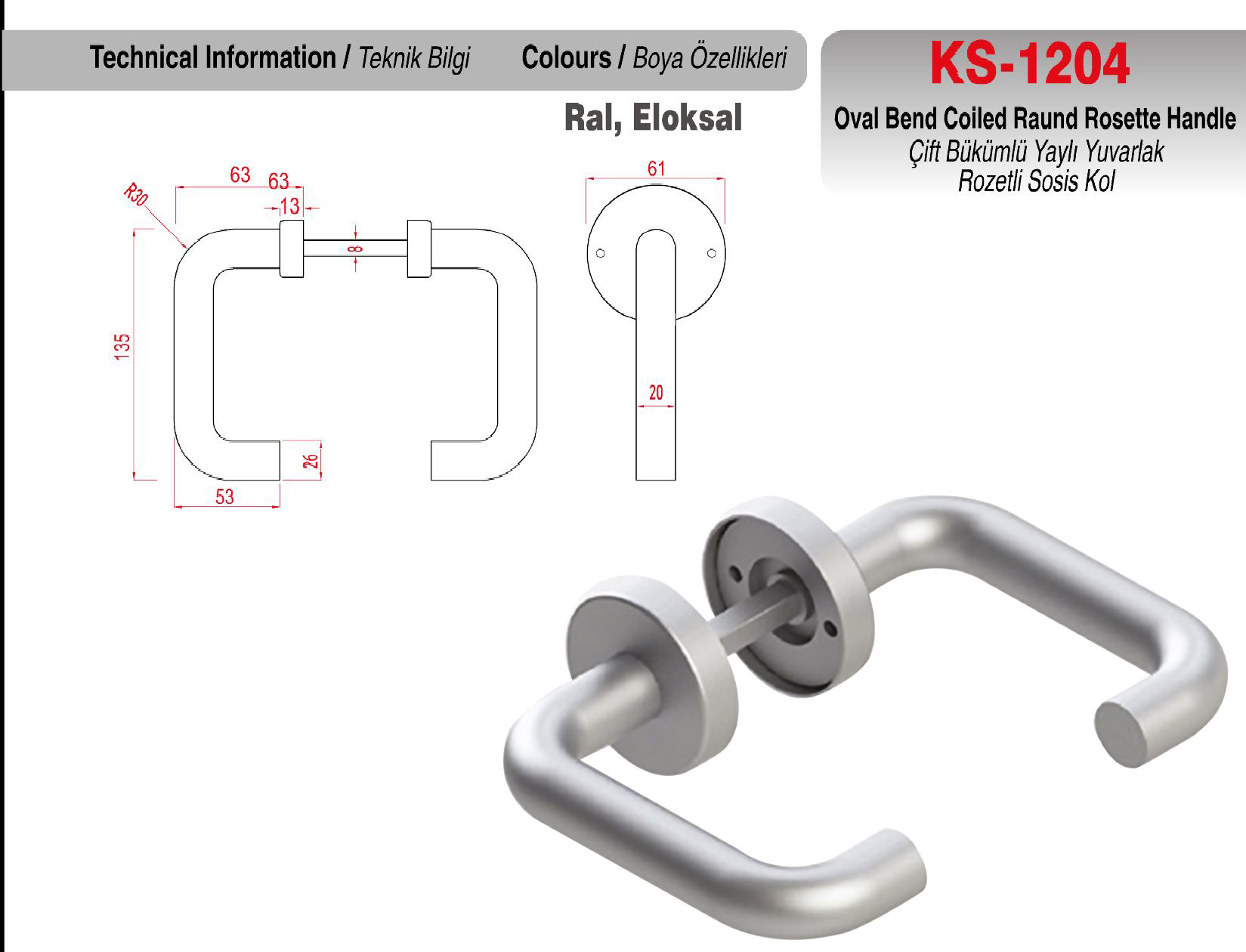 KS-1204 Alüminyum Çift Bükümlü Yaylı Yuvarlak Rozetli Sosis Kol, Alüminyum Kapı Sistemleri için tasarlanmıştır. Kolay Montaj ile zaman tasarrufu sağlar. KS-1204 Alüminyum Çift Bükümlü Yaylı Yuvarlak Rozetli Sosis Kol, Eloksal ve Elektrostatik toz boya seçenekleri ile istenilen yüzey rengi uygulanabilmektedir. |