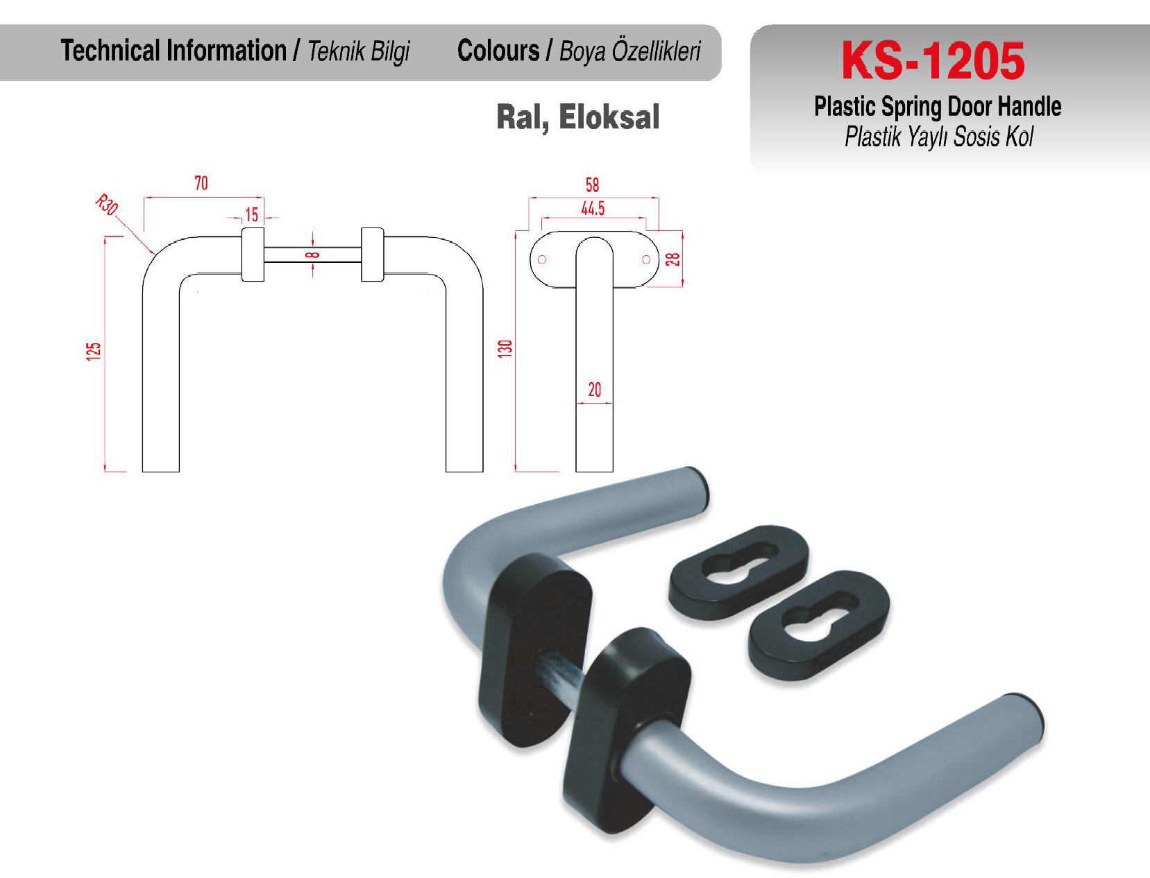 KS-1205 Alüminyum Pvc Rozetli Yaylı Sosis Kol, Alüminyum Kapı Sistemleri için tasarlanmıştır. Kolay Montaj ile zaman tasarrufu sağlar. KS-1205 Alüminyum Pvc Rozetli Yaylı Sosis Kol, Eloksal ve Elektrostatik toz boya seçenekleri ile istenilen yüzey rengi uygulanabilmektedir. |