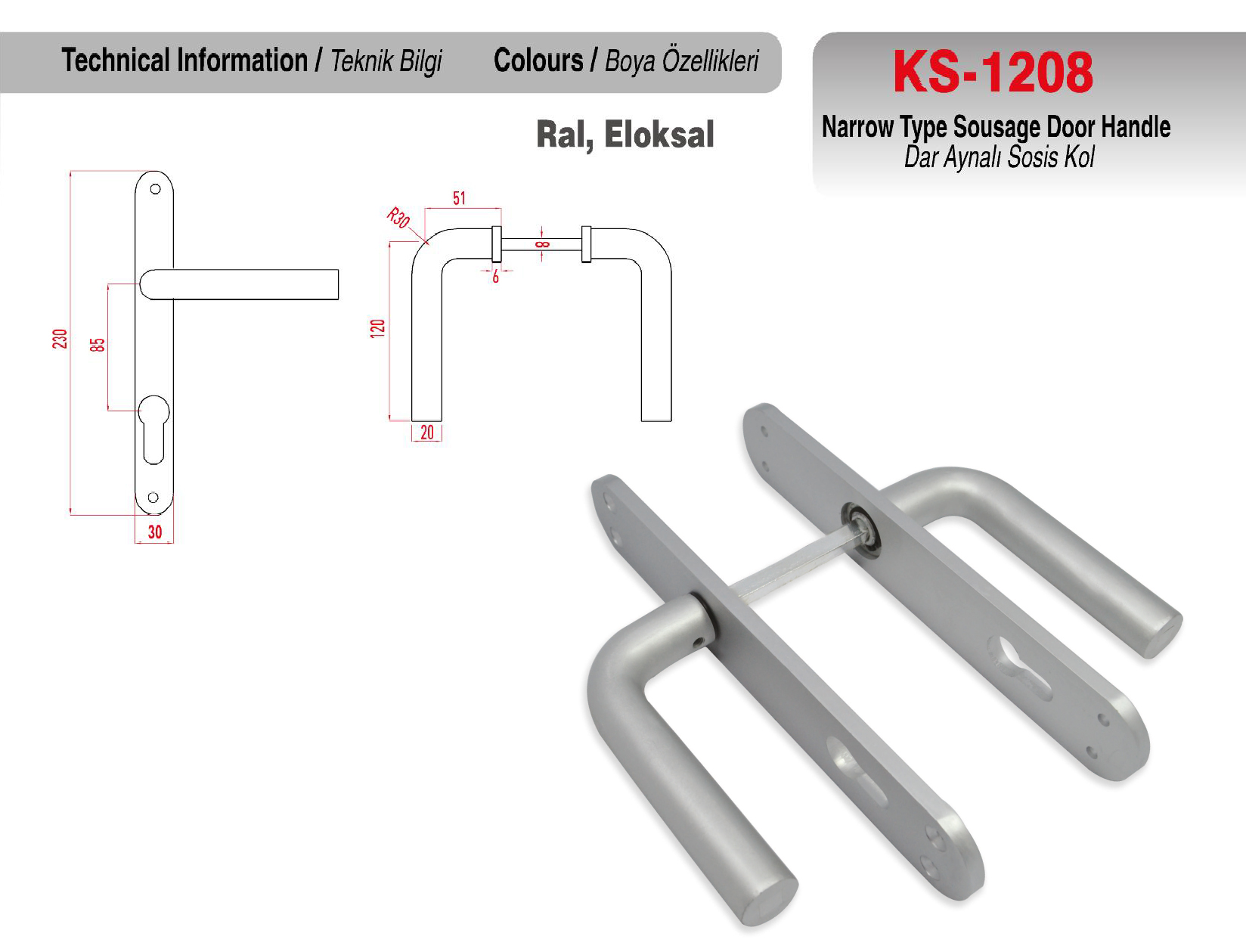 KS-1208 Alüminyum Dar Aynalı Sosis Kol, Alüminyum Kapı Sistemleri için tasarlanmıştır. Kolay Montaj ile zaman tasarrufu sağlar. KS-1208 Alüminyum Dar Aynalı Sosis Kol, Eloksal ve Elektrostatik toz boya seçenekleri ile istenilen yüzey rengi uygulanabilmektedir. |