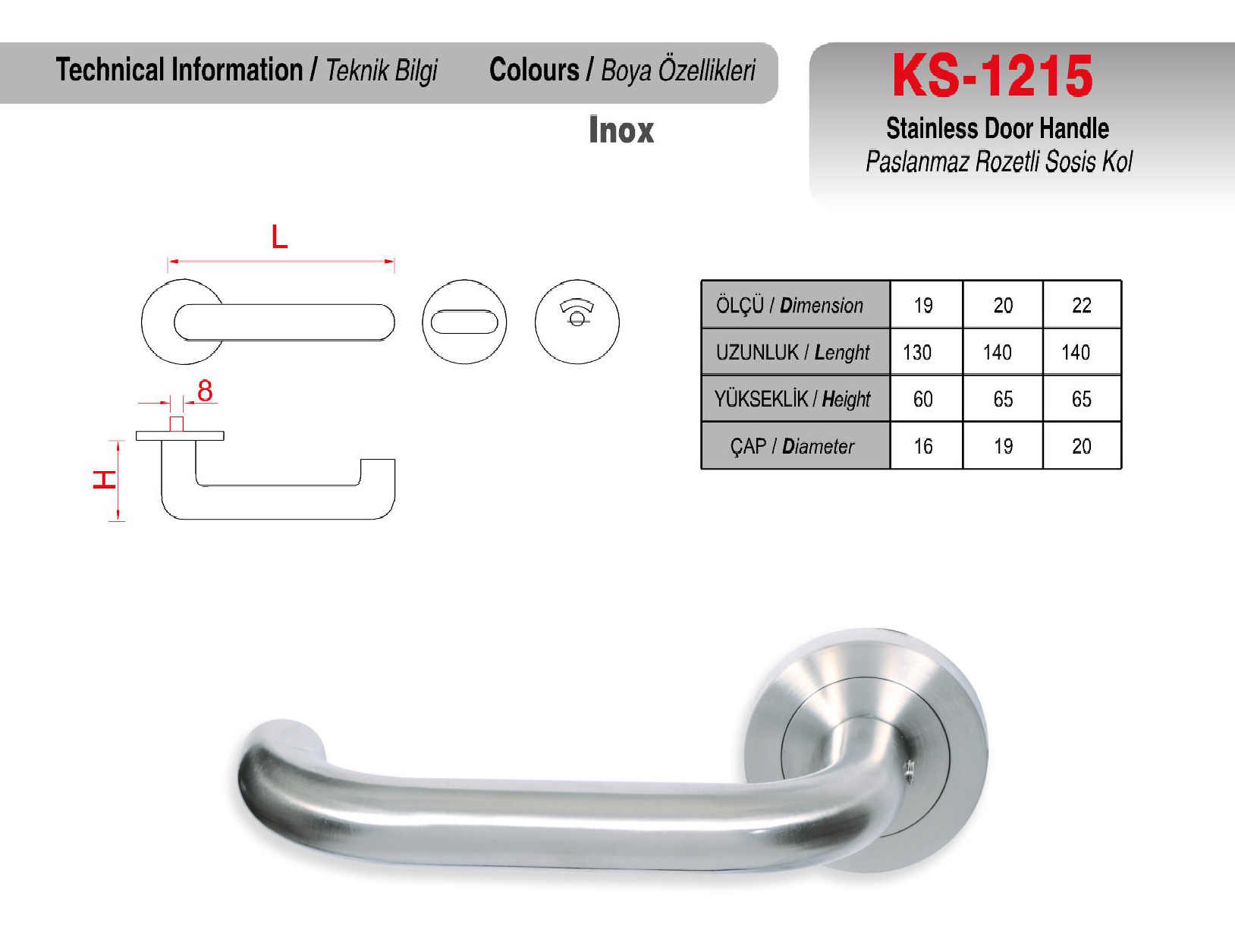 KS-1215 Paslanmaz Rozetli Sosis Kol paslanmaz inox yapısı ve şık tasarımı ile bulunduğunuz mekanlara kalite ve estetik katar. Oda kapılarında, ofis kapılarında kullanımı tercih edilir. |