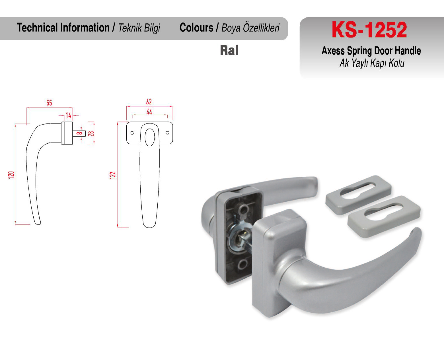 KS-1252 Alüminyum Yaylı Kapı Kolu, Kolay Montaj ile zaman tasarrufu sağlar. Şık tasarımı ile bulunduğunuz mekanlara kalite ve estetik katar. KS-1252 Alüminyum Yaylı Kapı Kolu, Eloksal ve Elektrostatik toz boya seçenekleri ile istenilen yüzey rengi uygulanabilmektedir. |