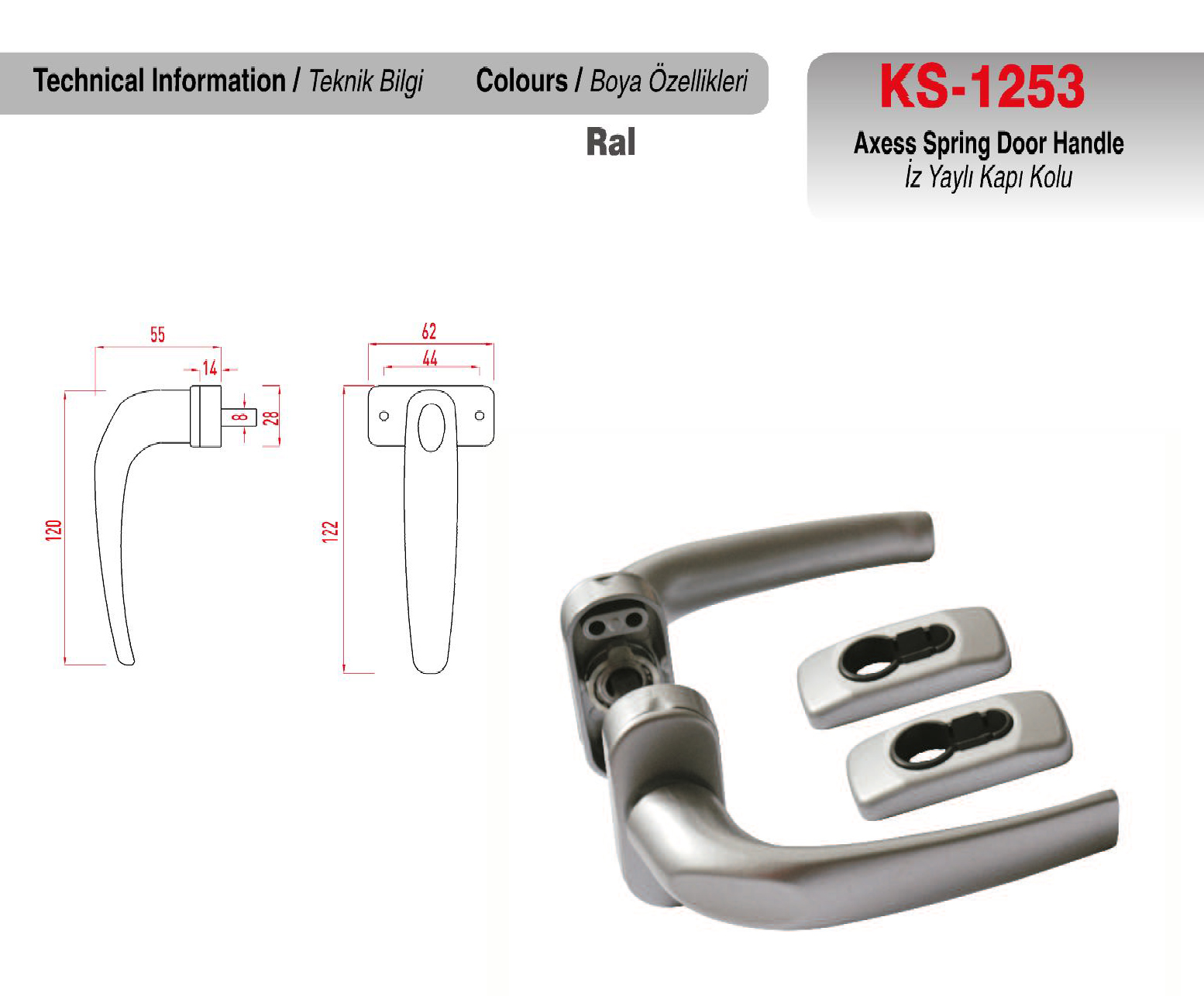 KS-1253 Alüminyum Yaylı Kapı Kolu Parmak İzli, Kolay Montaj ile zaman tasarrufu sağlar. Şık tasarımı ile bulunduğunuz mekanlara kalite ve estetik katar. KS-1253 Alüminyum Yaylı Kapı Kolu İzli, Eloksal ve Elektrostatik toz boya seçenekleri ile istenilen yüzey rengi uygulanabilmektedir. |