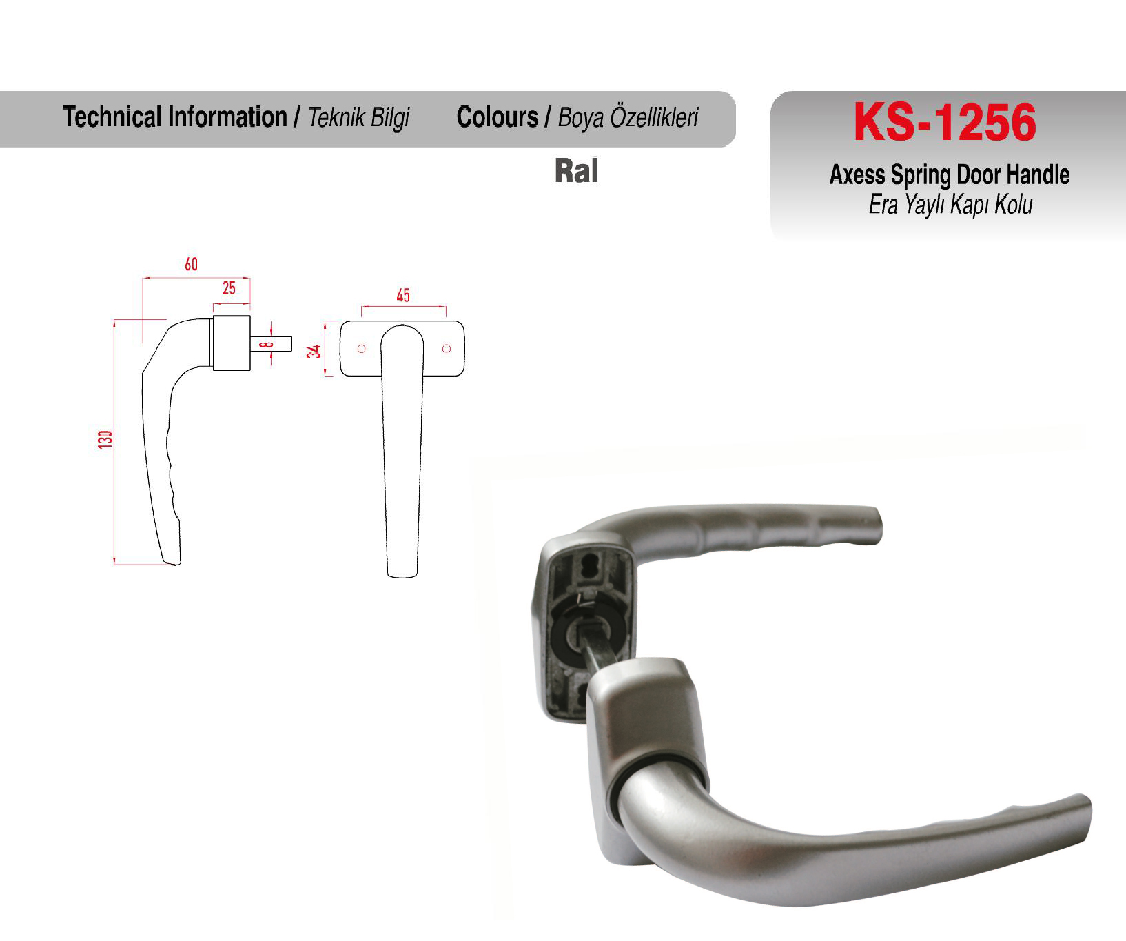 KS-1256 Alüminyum Yaylı Kapı Kolu, Kolay Montaj ile zaman tasarrufu sağlar. Şık tasarımı ile bulunduğunuz mekanlara kalite ve estetik katar. KS-1256 Alüminyum Yaylı Kapı Kolu, Eloksal ve Elektrostatik toz boya seçenekleri ile istenilen yüzey rengi uygulanabilmektedir. |