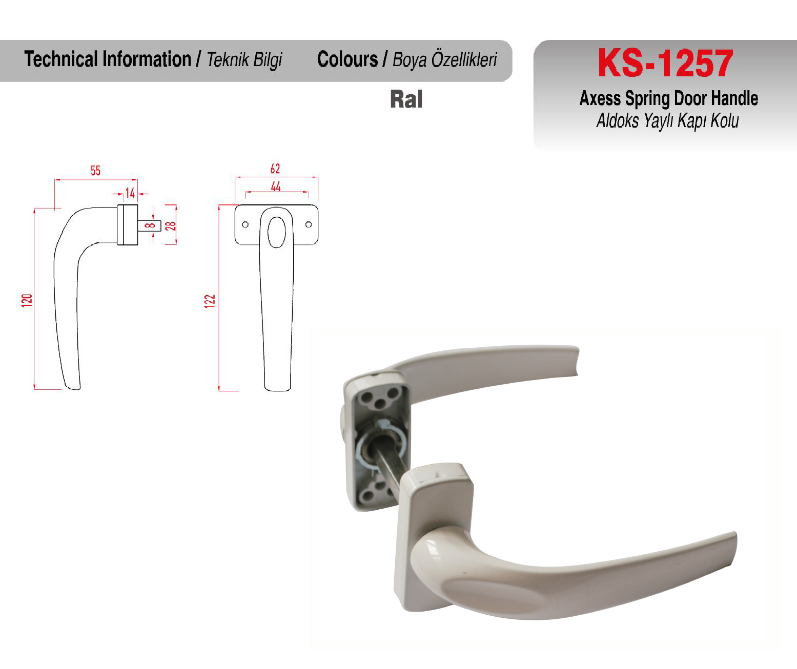 KS-1257 Alüminyum Yaylı Kapı Kolu Aldoks, Kolay Montaj ile zaman tasarrufu sağlar. Şık tasarımı ile bulunduğunuz mekanlara kalite ve estetik katar. KS-1257 Alüminyum Yaylı Kapı Kolu Aldoks, Eloksal ve Elektrostatik toz boya seçenekleri ile istenilen yüzey rengi uygulanabilmektedir. |