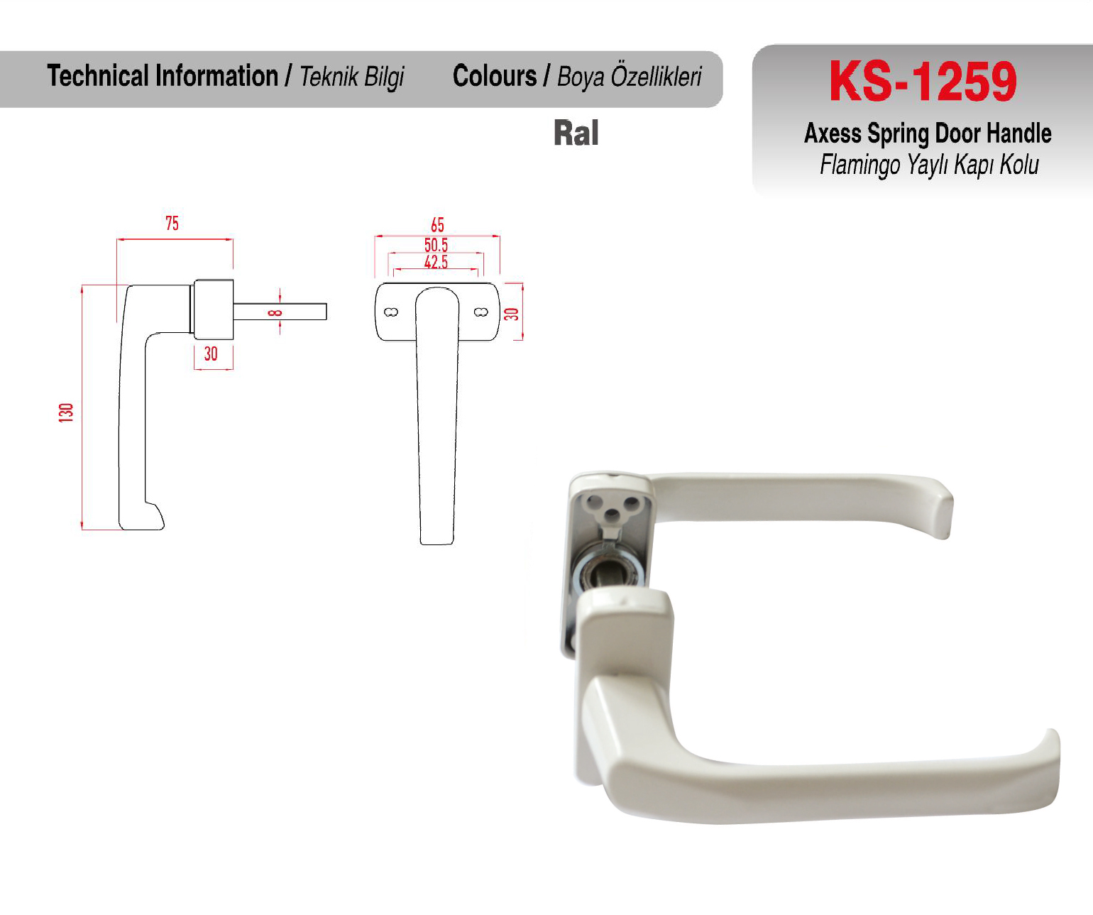 KS-1259 Alüminyum Yaylı Kapı Kolu Flamingo, Kolay Montaj ile zaman tasarrufu sağlar. Şık tasarımı ile bulunduğunuz mekanlara kalite ve estetik katar. KS-1259 Alüminyum Yaylı Kapı Kolu Flamingo Elektrostatik toz boya seçenekleri ile istenilen yüzey rengi uygulanabilmektedir. |