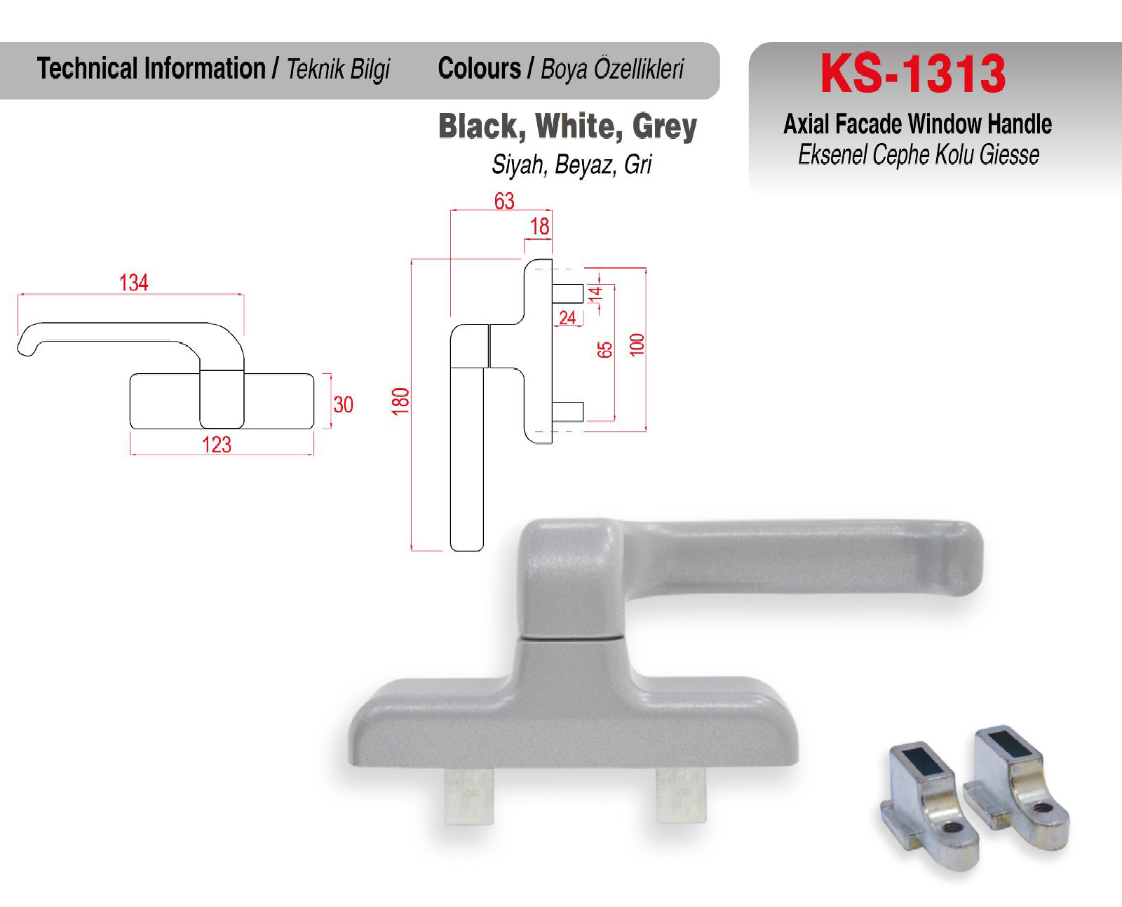 KS-1313 Alüminyum Eksenel Cephe Kolu Çift Maçalı Giesse, kolay montaj ile zaman tasarrufu sağlar. Şık tasarımı ile bulunduğunuz mekanlara kalite ve estetik katar. KS-1313 Alüminyum Eksenel Cephe Kolu Çift Maçalı Giesse Siyah, Beyaz, Gri renk seçenekleri ile mekanlarınıza renk katar. |