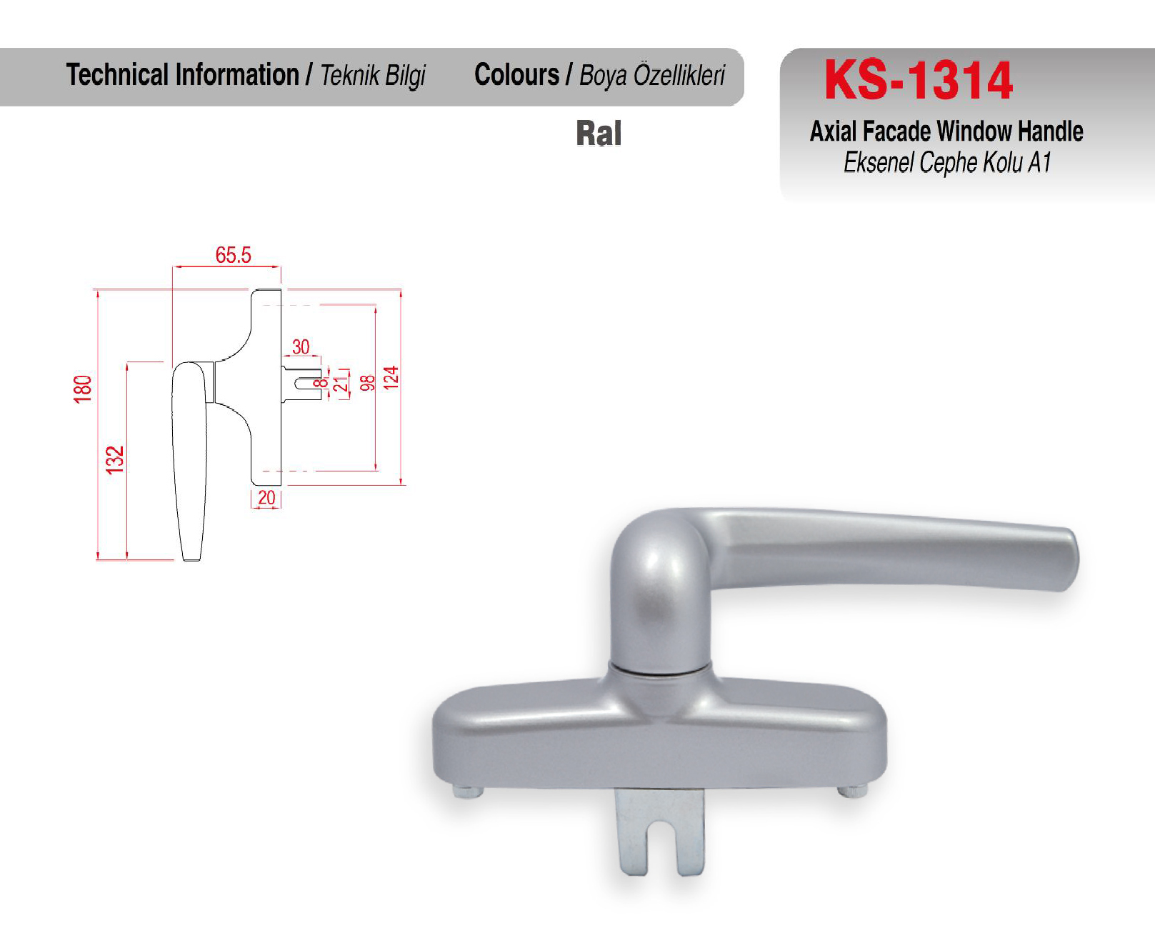 KS-1314 Alüminyum Eksenel Cephe Kolu, kolay montaj ile zaman tasarrufu sağlar. Şık tasarımı ile bulunduğunuz mekanlara kalite ve estetik katar. KS-1314 Alüminyum Eksenel Cephe Kolu Elektrostatik toz boya seçenekleri ile istenilen yüzey rengi uygulanabilmektedir. |
