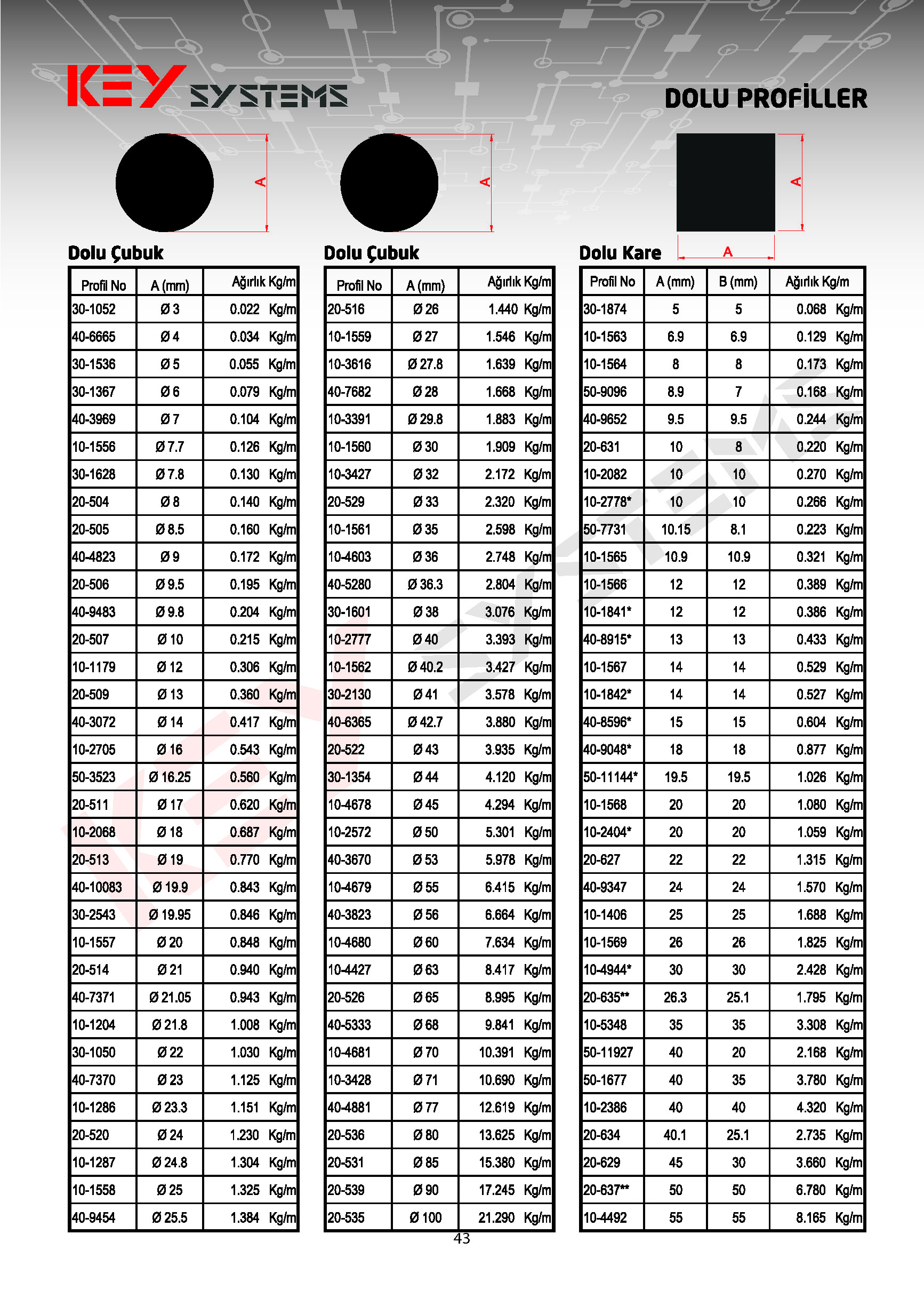 KEY YAPI SİSTEMLERİ olarak farklı boyut ve ebatlarda Standart Alüminyum Lama ve Dolu Profiller ile ihtiyaçlarınıza uygun ürün çeşitliliği sayesinde sizlere en iyi hizmeti vermektedir. Eloksal ve Elektrostatik toz boya seçenekleri ile istenilen yüzey rengi uygulanabilmektedir. | ||